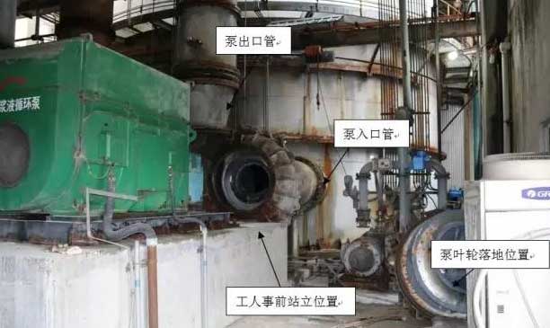 14時38分,當工作人員擰下A泵端蓋兩側螺栓,開始用頂絲持續頂泵體端蓋時,A漿液循環泵泵體突然隨大量漿液水沖出,位于端蓋前檢修人員于某受撞擊倒地,遭其碾壓,右側大腿嚴重受傷。