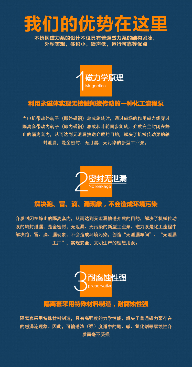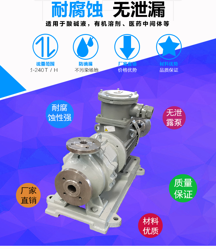 WJC不銹鋼磁力泵過流部件采用全不銹鋼材料(304、316、316L),內(nèi)、外磁轉(zhuǎn)子選用高磁能積、高矯頑力的稀土永磁制造,具有高效節(jié)能、介質(zhì)適用面廣、耐高溫、磁性強(qiáng)、不退磁等優(yōu)點(diǎn),對有機(jī)酸,有機(jī)化合物,堿,中性溶液和各種氣體都有良好的耐蝕性,雙螺旋糟碳石墨軸承和硬質(zhì)合金軸套,具有較強(qiáng)的耐磨性,是應(yīng)用磁力耦合實(shí)現(xiàn)無接觸傳動、無動密封的新型高品質(zhì)磁力化工泵。保證了產(chǎn)品的壽命,是無泄漏輸送腐蝕性介質(zhì)的理想用泵。