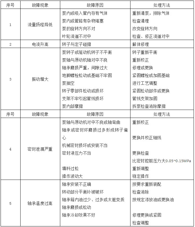 耐腐蝕泵是具有耐腐蝕性能的泵,適合輸送酸,堿,鹽等腐蝕性液體,對(duì)于耐腐蝕泵的故障及維修方法有哪些呢,常見的故障做出分析及加以解決,下表一目了然: